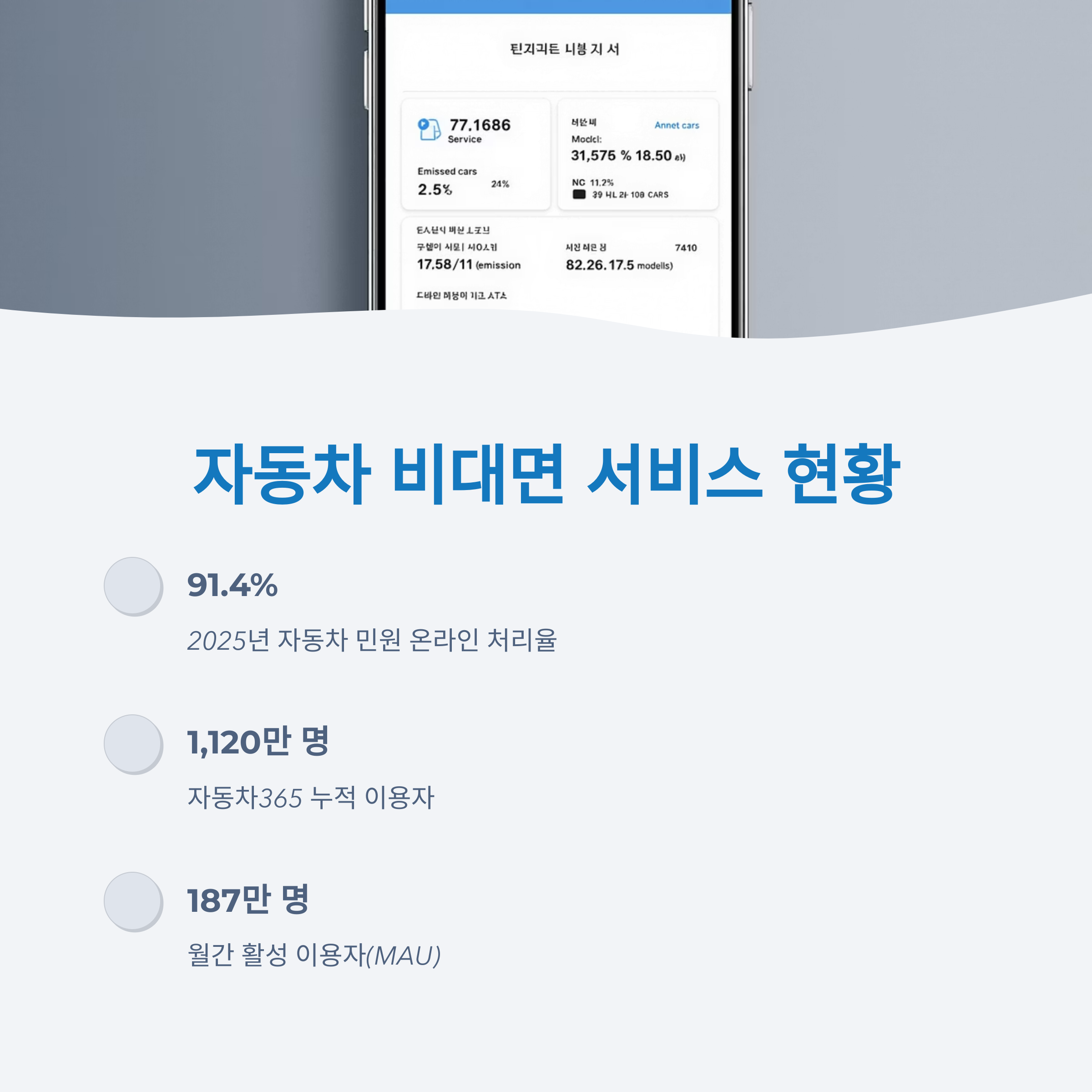 - 2025년 상반기 기준, 전국 자동차 민원 90% 이상이 모바일·온라인으로 처리.