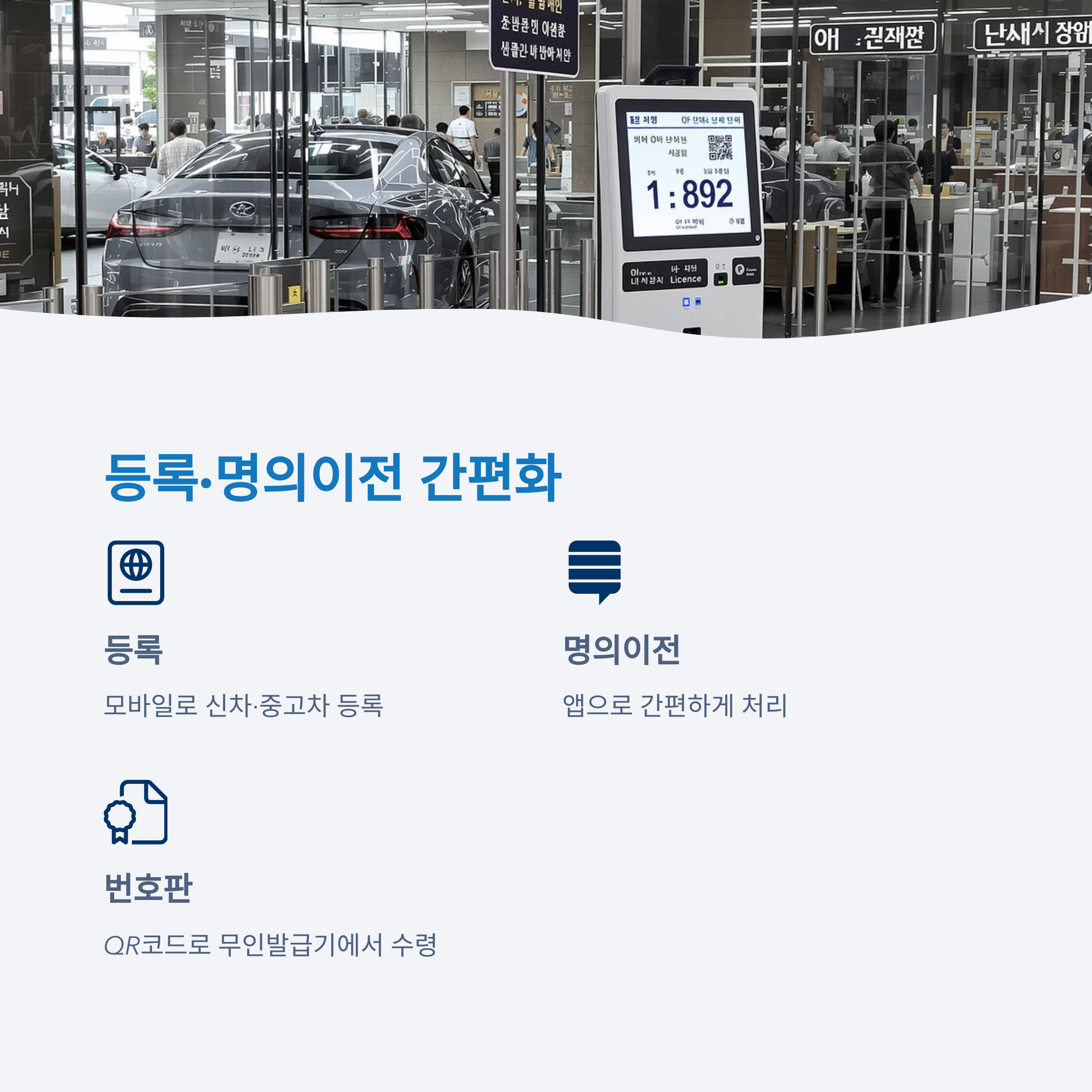 - 전자증명서·QR코드: 모든 증명서 모바일 발급, QR코드로 실물 번호판/서류 수령