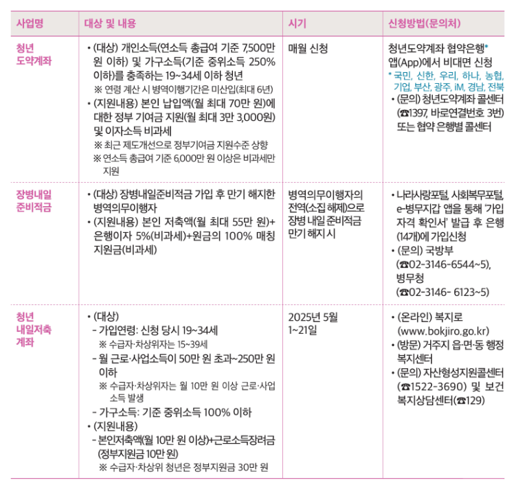 - 지원 내용: 본인 저축액(월 10만 원 이상)에 대해 정부지원금 최대 월 30만 원 매칭